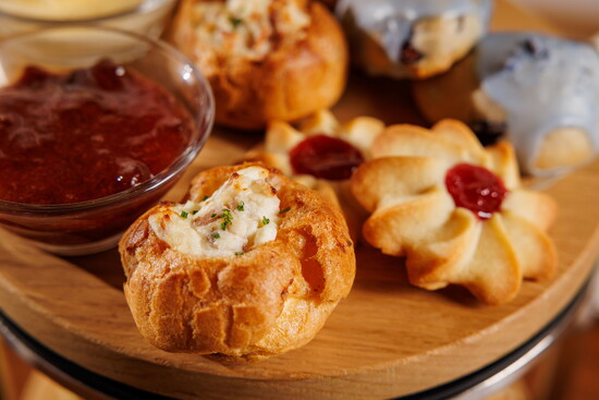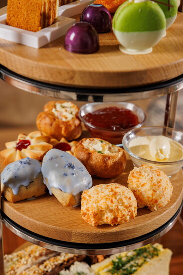Tea time fare offerings include Raspberry Shortbread Cookies and Lemon-Yuzu Glazed Madeleine Cookies. The resort's scones and savory treats elevate the experience to the next level, featuring Blueberry Lavender Scones served with Clotted Cream and Seasonal Jam, as well as a selection of savory bites like Ham & Cheese Puff Pastry, Egg Salad Sandwiches and Smoked Salmon & Dill Sandwiches.