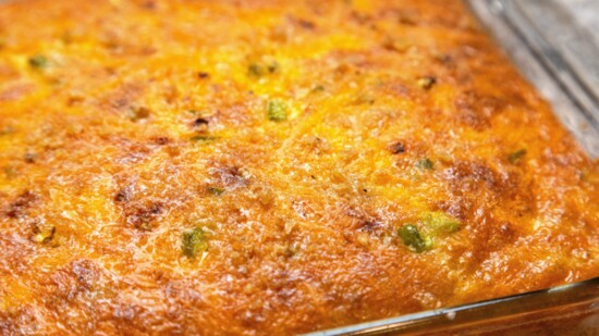 2. In a large bowl, whisk cornstarch into the heavy cream until smooth. Add 1½ cups of cheddar, the creamed corn, fresh corn, jalapeños, melted butter, eggs and salt. Stir well and taste to adjust seasoning.