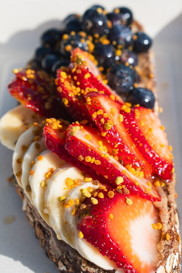 · Almond Butter Toast – Organic raw almond butter, banana, blueberry, strawberry, bee pollen, raw honey