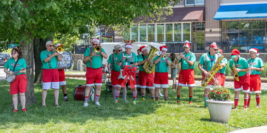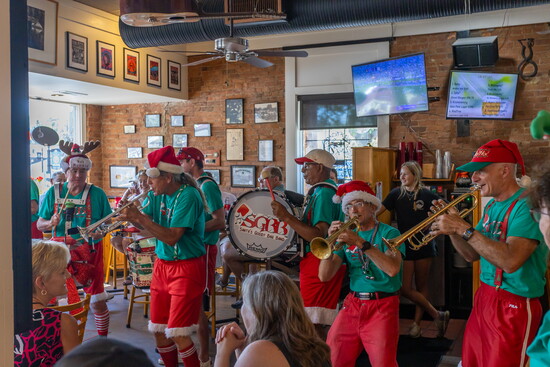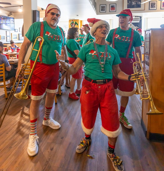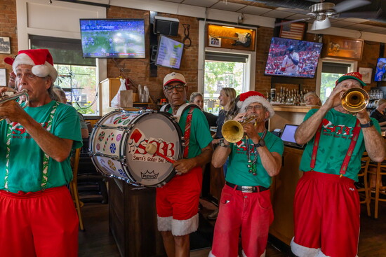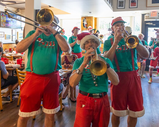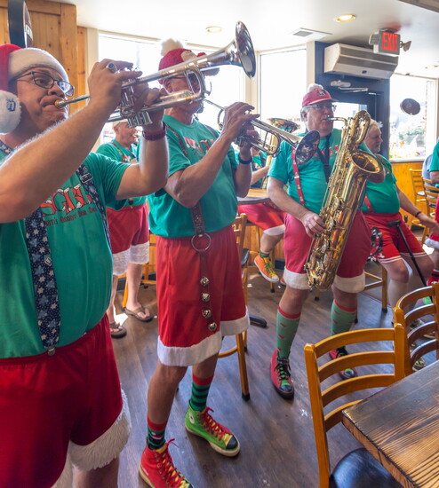 The group’s costumes are as legendary as their music. Summer gigs feature red shorts trimmed with white fur, green T-shirts, and Santa hats of every style imaginable. When winter rolls around, the band switches to red union suits and black shorts, still with white fur, of course. Many musicians decorate their instruments with lights, garland, and ornaments that glow as they play.