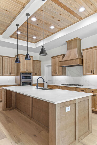 Step inside, and the natural tones continue. Stained maple cabinetry pairs beautifully with engineered wood flooring, while the warmth of stained tongue-and-groove cypress ceilings elevates the foyer, living room, and master suite. Medium wood tones balance the lighter walls and countertops, creating a warm yet airy interior that feels both stylish and welcoming.