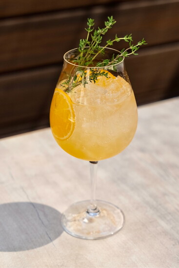 At first glance, the drink is striking. A golden hue glows through the glass, brightened by a fresh orange slice and finished with a fragrant sprig of thyme resting gently on top. Condensation forms along the bowl of the glass, catching the light and hinting at the crispness waiting inside.