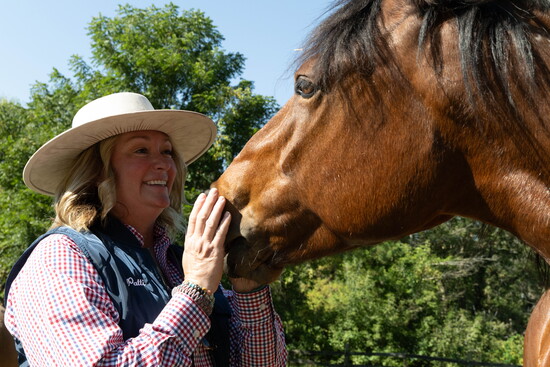 Patti’s own journey with mustangs began decades ago. She grew up in the saddle, and in her late twenties brought home her first wild mustang. Later, she adopted a stallion named Padré, who went on to make history as the first wild horse to qualify for Dressage at Devon, one of the most prestigious horse shows in the country. That experience inspired her to give back and to use the power of horses to help others heal.