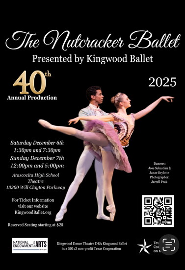 Each year, the Kingwood Ballet partners with Atascocita High School’s theater department to present its full-length production of The Nutcracker. Tickets start at just $25, making it possible for families and organizations across the area to enjoy a professional-level performance without leaving the local area avoiding Houston traffic and Downtown parking.