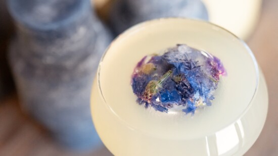 The garnish is the stylish showstopper of this cocktail. Add edible flowers to a sphere ice mold with water. After freezing overnight, you’ll have a stunning flower bomb that's sure to impress.