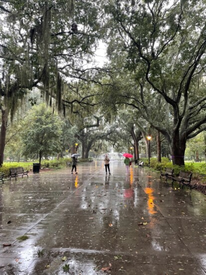 We have photos from the trip taken in historic Forsyth Park. When I show people, they say, “It almost looks like you had the whole park to yourselves!” We did. Because not everyone is willing to walk around that park in torrential rain like eight women from Minnesota who just roll. with. it.