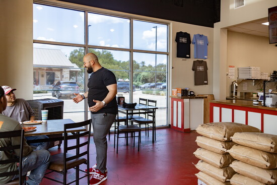 Still, he isn’t afraid to have a little fun. Slice Street’s recent “Slice of the Month”—the Blueberry Pie—pushes flavor boundaries with Brie cheese, blueberries, hot hatch chiles, and a swirl of hot honey on a white pizza. Other unexpected specials have ranged from a brisket pizza, crafted alongside Kareem El-Ghayesh of Austin’s KG BBQ, to an Australian-inspired slice topped with Vegemite, bay shrimp, tomatoes, and basil. Collaborations with Pig Pen BBQ, the Great British Baking Company, and Natkhat Flavors have also led to one-of-a-kind recipes. “We’ve put together ideas that turn out beautifully on a pizza,” Aram says.