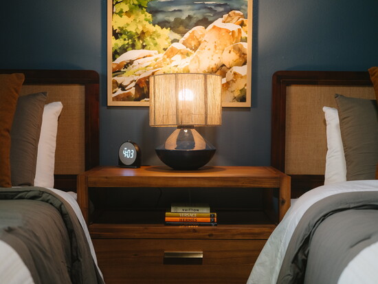 For example, for a recent rental project in Bentonville, we leaned into local heritage, focusing on Native American history to guide the design. The Osage, Caddo, and Quapaw nations have a heavy influence here. We purchased some of the decorations at the gift shop in The Museum of Native American History in Bentonville. We also sourced local art from the Beaver Lake area, and a huge piece of Sycamore from Timberwolf Saw Mill for a headboard.
