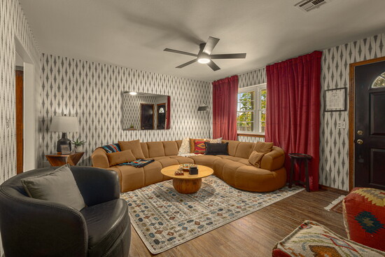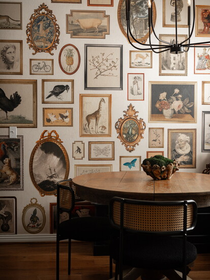 The home belonged to our client’s late father, and she didn’t want to sell or do any construction. There were still some pieces of antique furniture and other existing design elements that were interesting. Ashlynn started a mood board, giving the front room a Clue [board game] vibe, and I thought, “That’s it! Let’s do the entire house in this Clue theme, but tasteful.”