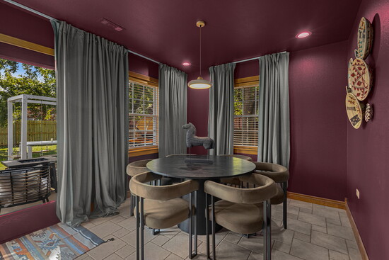 Ms. Peacock has the master suite. We color-drenched the bathroom in “Bordeaux Red” by Benjamin Moore, and carried that color into the bedroom with the lamp shade and velvet curtains. We also found an amazing peacock print wallpaper. For final touches, we framed some vintage Clue games and hung them on the wall in the front Conservatory-themed room, plus a 1985 Clue movie poster in the entryway to give guests a hint at the design theme.