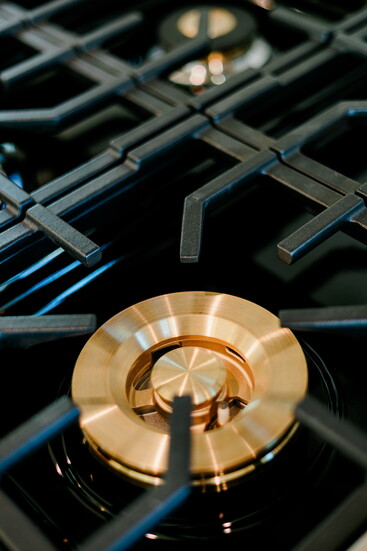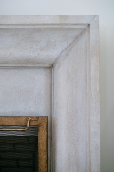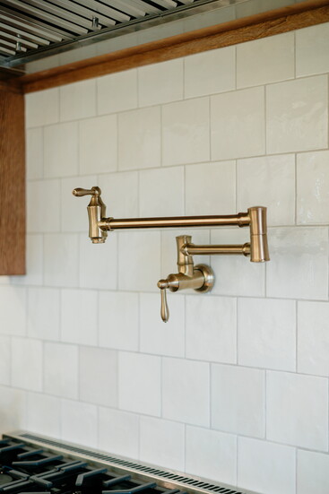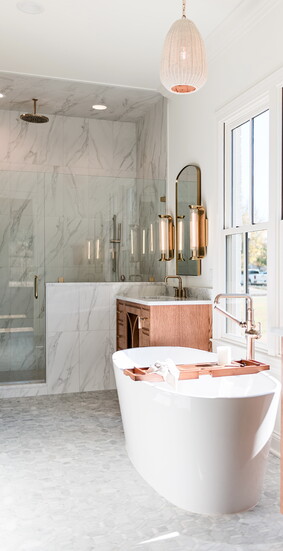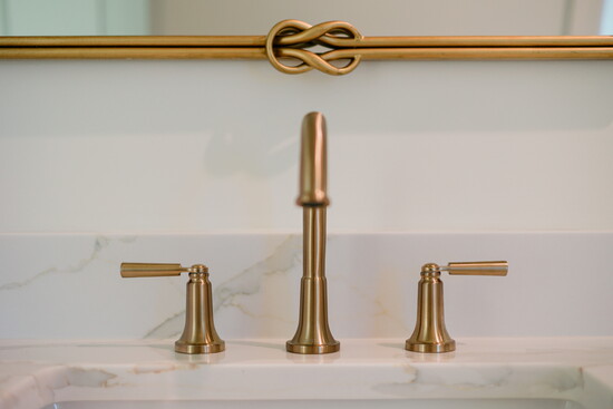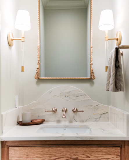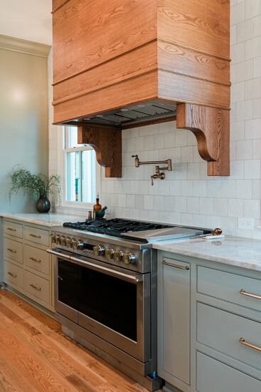 The Taj Mahal marble countertops by AJ Stone and Company add to the Eleanor's timeless sophistication. While the Top Knob brass along with Delta faucet in champagne bronze add a vintage feel to accent the cabinetry by SCS Cabinets. But perhaps the star of the show is the gorgeous SCS Cabinet's designed oak hood, a focal point as soon as you enter the room. The Bedrosian tile backsplash by Big Cove Decorating creates a seamless look with the wood and marble. And for a pop of color in a muted French inspired hue, Elle Du Monde chose Sherwin Williams Silver Gray. A true work of art, this kitchen isn't just calming with its various textures and tones, but the utmost functional space for cooking and entertaining with its large island, GE appliances and the smart addition of a pot filler above the range.