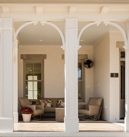 The Eleanor home's facade is based on 1800s-1900’s Italianate architecture and features clean vertical massing with ornate cornice and porch column detailing. A nod to the architectural history of downtown Huntsville's Twickenham district, where Italianate architecture dates back to the 1800s. With homes like the Morgan-Neal House (1823), The Historic Lowry House (1818), and the Goldsmith-Donovan House (1887) still standing in all their brackets, cornices, and arches today.