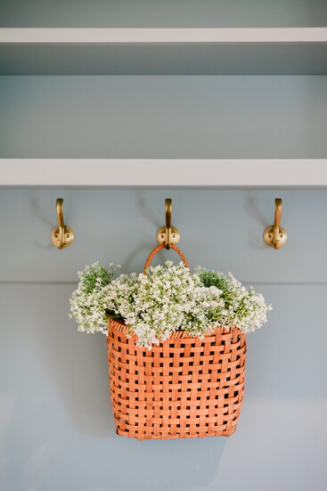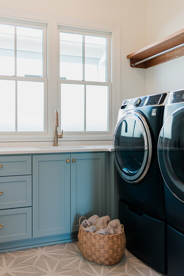 Another favorite room in the home - the laundry room. Sherwin Williams Silver Gray paint ties this room into the rest of the home while thoughtfully designed cabinets and nooks provide the type of storage every family dreams of.