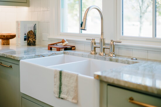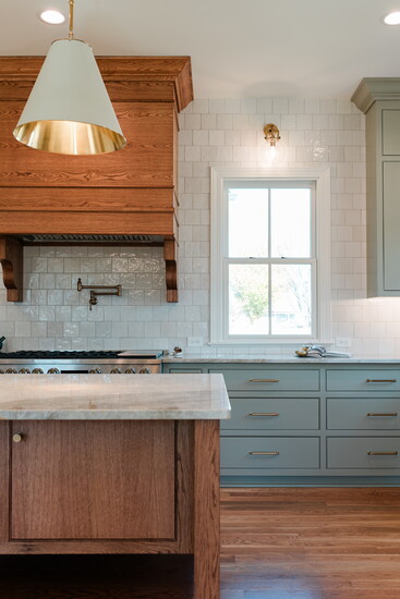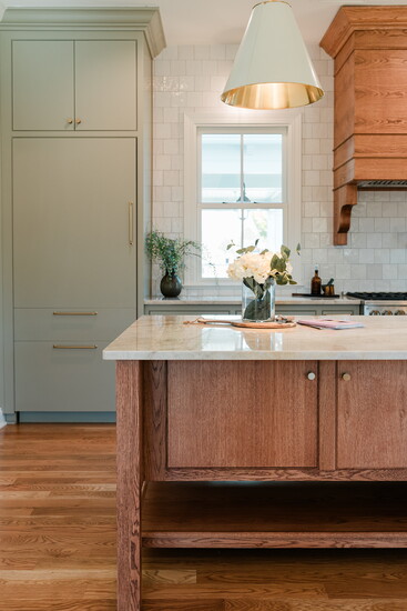 "Carrying white oak flooring through out the home with a coordinating white oak island that is free standing, designed to look like an old table, helped bring in the classic historic feel of old school carpentry," says Landon. "Modern high-end kitchen appliances with euro panel custom painted cabinetry helped keep the home modern and stylish."