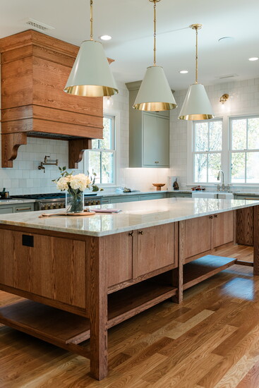 The kitchen is heart of the Eleanor home with its openness and airiness inviting guests to linger and converse around the large wood kitchen island accented by three large Visual Comfort pendant lights from Huntsville's multi-generational run Richard's Lighting.
