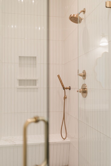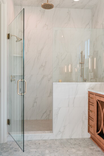 The wood elements do not stop at the kitchen. You can find oak cabinetry in the master bath as well. A free standing tub by the window invites for a nightly bubble bath ritual. The marble shower with Delta fixtures in champagne bronze takes this bathroom to another level of refinement.