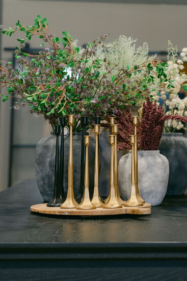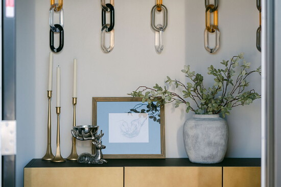 Balance comes from contrast. Varying the height of candlesticks, art, and vessels allows the eye to move through the vignette with ease.