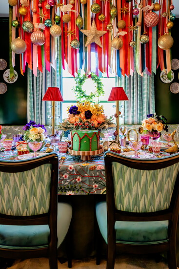 Drum ornaments she found from At Home serve as both placecard holders and the “12 drummers drumming.” Colorful ribbons and ornaments hang from the ceiling to add extra holiday flair to the table.
