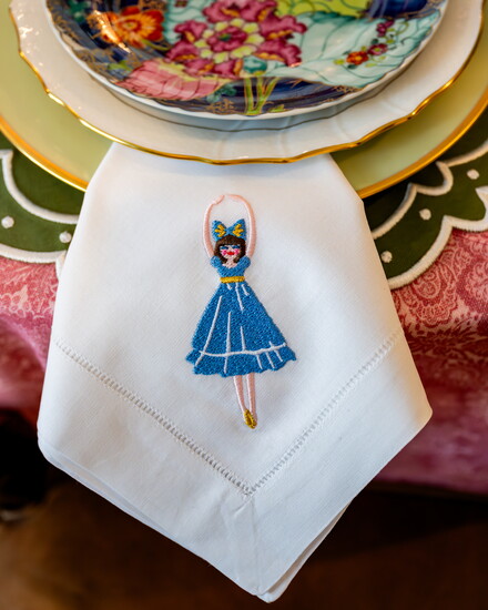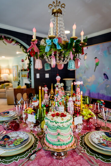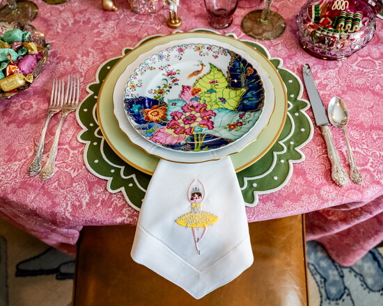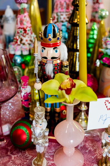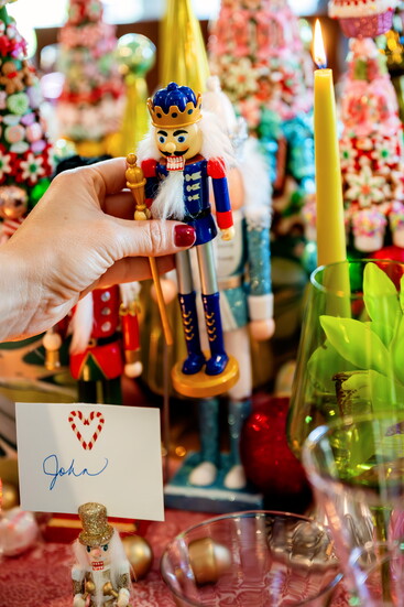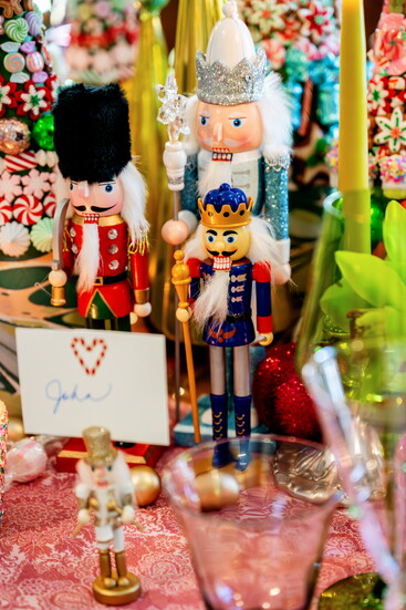Henry has a similar level of detail. She used Neiman Marcus-inspired candy trees and sequined votives from House and Parties to add sparkle to the Nutcracker-themed napkins and placeholders adorning each setting.