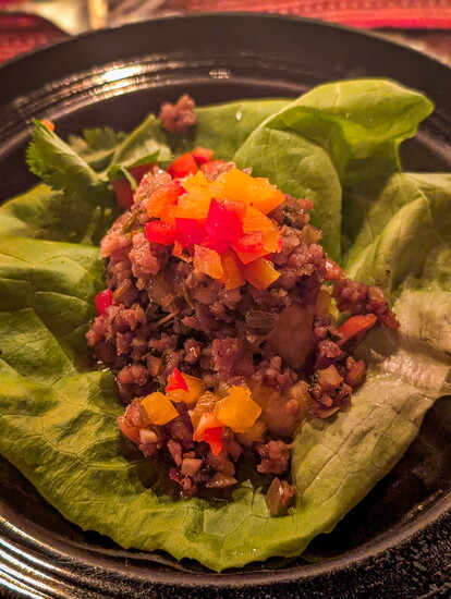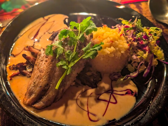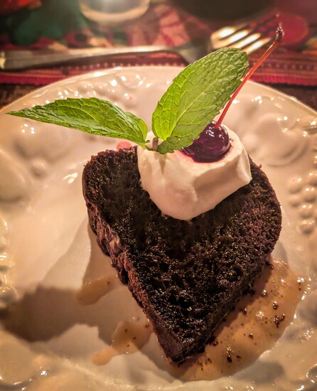Inside, we gathered around family-style tables with our wine bottles, ready for a multi-course meal. Chef Lisa Whisnant introduced herself and described the culinary journey ahead. We started with homemade hot apple cider, followed by cheese and a signature asparagus and sesame seed appetizer. The salad tasted as if it had just been picked from the garden, and the main course—an unconventional but delicious preparation of fish and rice—was a true symphony of flavors. The pièce de résistance was a moist chocolate cake with homemade toppings, the perfect ending to a meal no one would expect to find in a yurt in the middle of the forest.