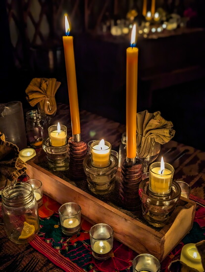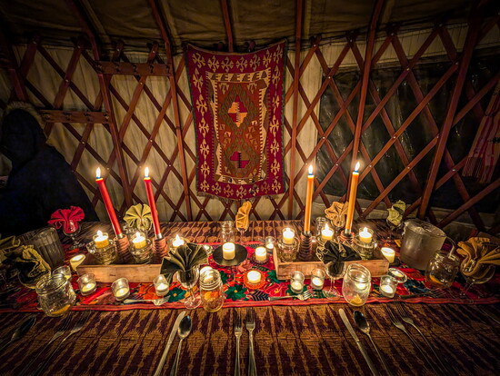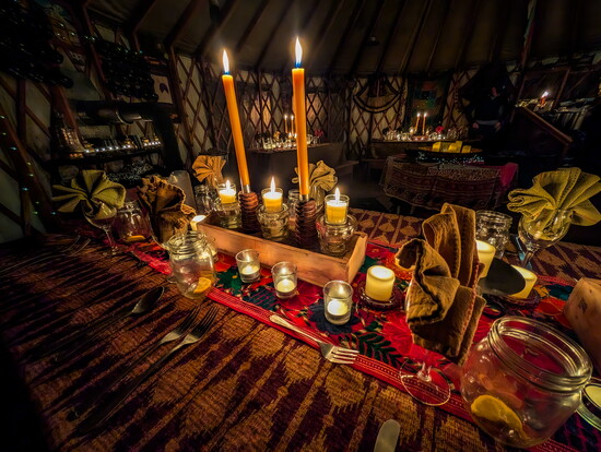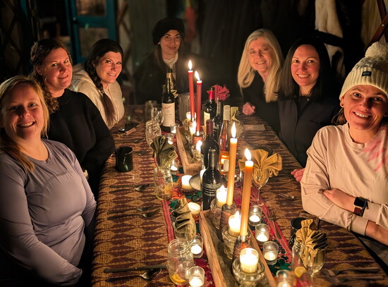 Back at the house, we warmed up in the hot tub, dared each other to dip in the snow, then prepared for the highlight: a torch-lit snowshoe walk to a yurt in the forest. Like something out of a fairytale, the glow of string lights grew brighter and the scent of a fresh fire and countless candles inside created an ethereal atmosphere.