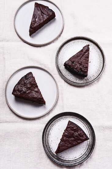 - Preheat the oven to 375°F. Line the bottom of an 8-inch round cake pan with parchment paper and lightly grease the sides. Add the butter and finely chopped chocolate to a large heatproof bowl. Microwave for 45 seconds on medium power. Remove from the microwave and stir. Repeat the process until melted and smooth. Allow the chocolate to cool slightly, then whisk in the sugar.