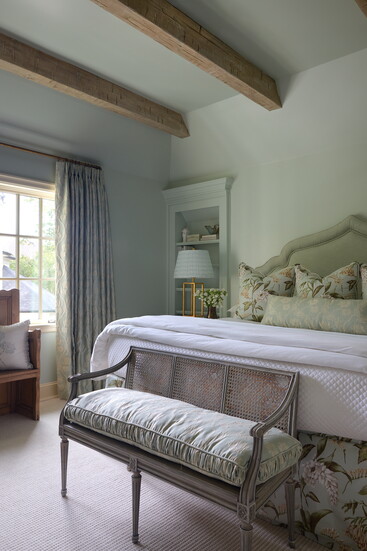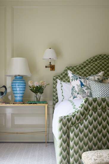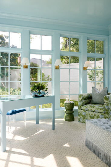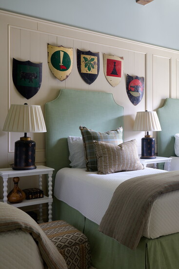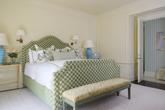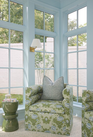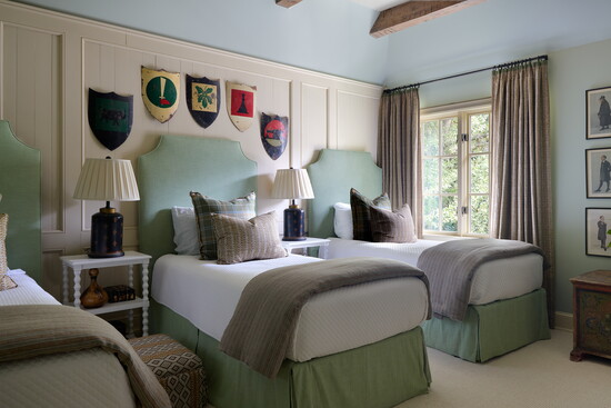 Klawinski’s favorite spaces are the ones where beauty and comfort meet. The living room, with its two custom green velvet sofas, is made for gathering—a spot where a big family can settle in, with room for eighteen. The sun room is a quieter retreat, painted blue from floor to ceiling and inspired by the gardens just outside. The grandchildren’s bedroom shines with charm and practicality, with three beds (not just two), bold patterns and tiny ottomans for climbing in and out. Every detail is designed for real life and for making memories.