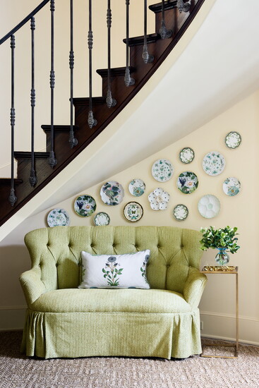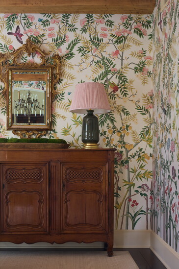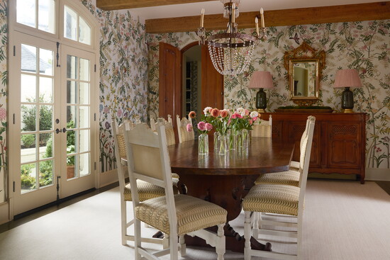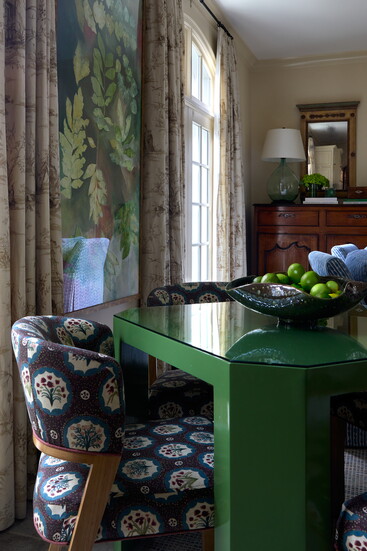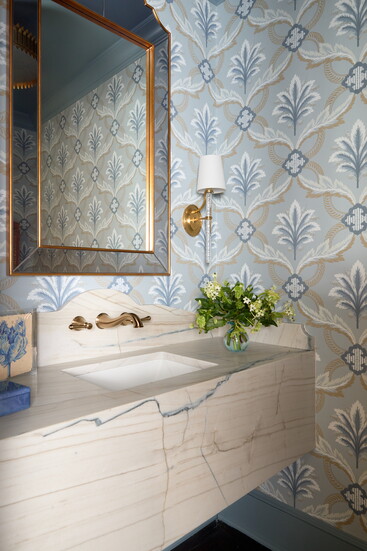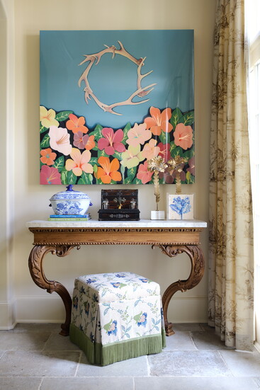 When the clients moved in, almost every room was reimagined. “We touched nearly every space. The entire house was one color when we started the project. We used wallpapers in seven spaces, painted nine rooms, added custom rugs to every room and used a mix of florals, plaids, geometrics and animal prints to add beautiful layers to a well-designed home.” Structural changes were made where they mattered most. “We gutted the powder room and created a gorgeous skirted quartzite vanity.” Art also played a meaningful role. “We commissioned or found several pieces of art from local Memphis artists for four of the spaces.” Throughout the process, trust was key. “The client was open to new and creative ideas and trusted me to design each of the rooms with thoughtful consideration to their love of color but desire to honor the French architecture of the home.”