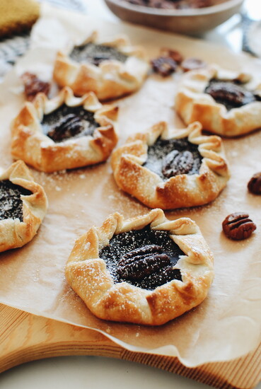 - Brush each crust with the egg wash, and place a pecan in the center of each galette. Bake for about 25 minutes, or until the crust edges are golden brown.