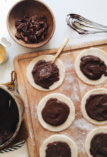 - Roll out the pie crusts, and cut into six 5-inch circles (a bowl works great!). Spoon a couple of tablespoons of pudding into the center of each pie circle and spread it out. Then fold the edges of the pie on itself.