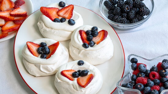 - When you’re ready to serve, top the pavlovas with fresh or store-bought whipped cream and your favorite summer berries.