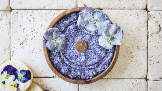 **Pansy-Mint Sugar: muddle pansy petals, mint leaves and granulated sugar. The purple color is completely natural and stunningly bright.