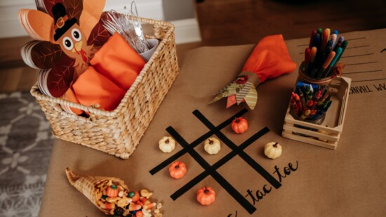 Boredom is a buzzkill, so keep the little peeps busy with a fun activity. First, get a roll of craft paper at any local craft store. Cover your tables. Write each child’s name on the paper in front of each seat with a thick black marker. Draw tic-tac-toe lines randomly on the paper and use small pumpkins as Os and Xs. Just make sure you have two different colors. To keep an attitude of gratitude, draw a “Things I Am Thankful For” sentiment with a few lines below so the kids can fill them in. (Tip: Never trust toddlers with permanent markers.) Set some crayons around the table for the kids to use.