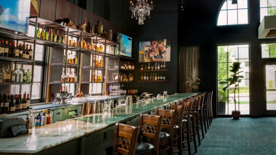 DC: Vivian Patrie, owner of Vivian Leigh Interiors, designed this space to have grace and elegance featuring chandeliers, fine art, and fully dressed white tablecloth tables. The bar features a Patagonia-green quartz top, crystal and etched glassware, and custom welded rod-iron shelves.