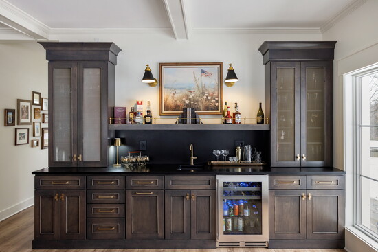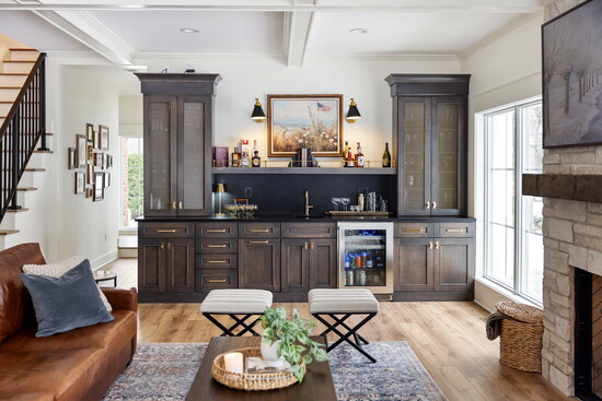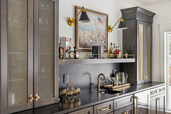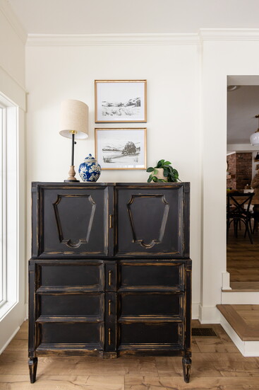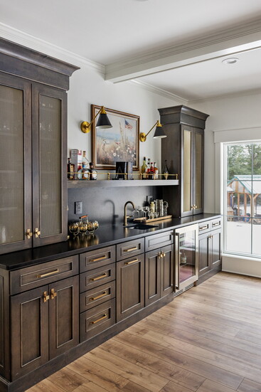 For the great room, Seminerio used an antique tall dresser from an antique store and created a wet bar by taking a weathered style cabinet, replacing the glass inserts with metal to give it the “vintage look.”