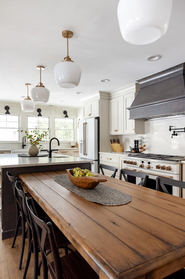 Prior to the renovation, the kitchen didn’t have an eating area. Seminerio fixed this by adding a vintage table to the oversized island she had sourced for the room. Bringing the two pieces together was the perfect juxtaposition of old and new, an aesthetic that appeals to Bush, who said, “I didn’t want formal or sterile.”
