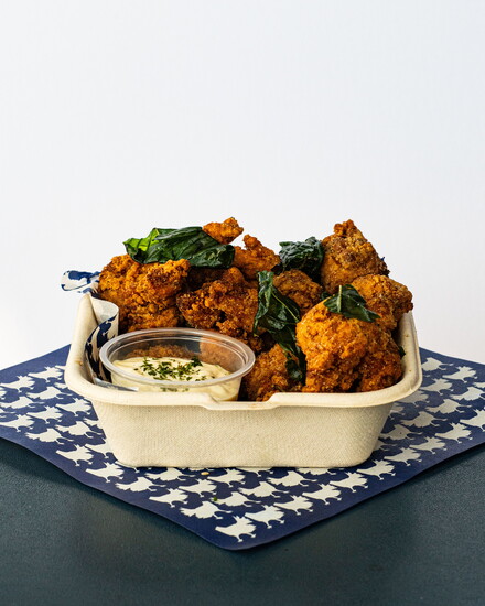 But it’s not just friendly vibes that keep the regulars coming back. The sandwiches are mouthwateringly good—options include ‘The Venice,” with a tangy yuzu ranch sauce and “The K-Town,” featuring a sweet gochujang glaze. Other popular orders include a delicious chicken Caesar salad as well as popcorn chicken, marinated with a Taiwanese blend of ginger, garlic and tamari, then tossed with a five-spice seasoning. The French fries—which can come on their own or “loaded”-style topped with the popcorn CHX—are coated with an invisible layer of potato starch so that they stay crispier longer. “For the roasted garlic aioli—served as a side—we take five pounds of garlic, cook it low and slow in neutral oil, and then we emulsify it with that oil,” Hyman explains.