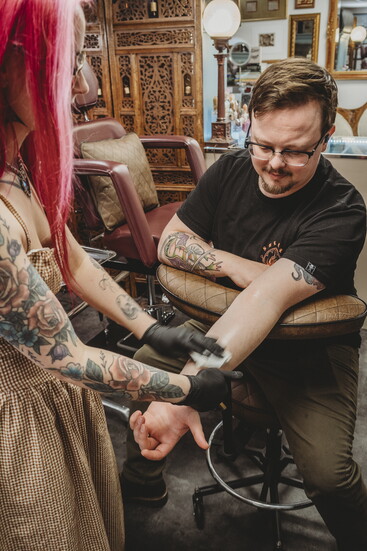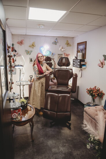 What Sammy has built — with Tucker managing scheduling and filtering out what he charmingly calls "the pains" — is less tattoo parlor, and more sanctuary. Their clientele is roughly 95% women between 17 and 40, though they also see older women, dads, grandmas, and lots of families coming in for piercings. They are, by every measure, not your typical studio.