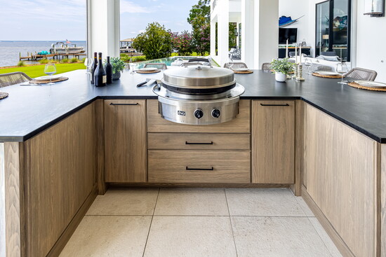 The warm and inviting Driftwood-style cabinetry, sourced from NatureKast—known for its weatherproof technology, provides generous storage and complements the richly saturated granite countertops. Materials were carefully selected to withstand the elements and maintain beauty over time.