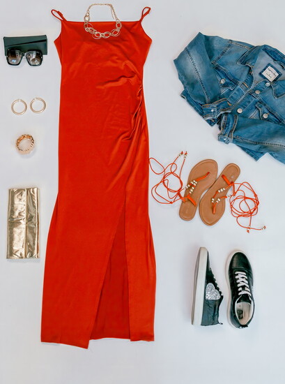 Accessories: Gold clutch, bangle, necklace, and rhinestone hoops, all available at DeAnna's Style Haus, Biltmore