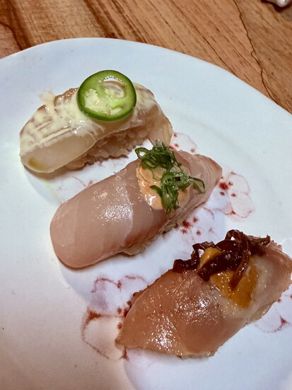 Tucked behind the dimly lit bar, you’ll find Konbini, a space as bright as a grocery store, (fitting since a konbini is a convenience store) and a sushi bar serving up an elevated dining experience courtesy of Chefs Michael Carranza and Danielle Martinez of acclaimed MICHELIN-recognized Tare. The menu, served until 1 a.m., can be enjoyed at the sushi bar or from papercut, and includes nigiri, sashimi, crudos, A5 wagyu and sandos served a la carte - with a Texas flair and Mexican influence on the Japanese cuisine.