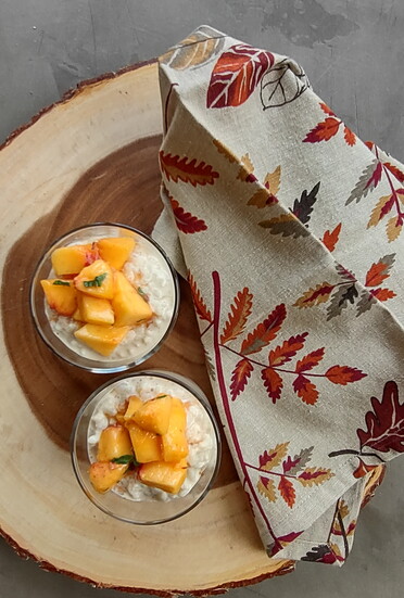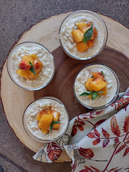 Here’s a decadent rice pudding that satisfies without guilt, thanks to arborio rice—the starchy short-grain rice used for risotto. Its natural creaminess means you need less butter and fewer eggs. Reduced-fat milk and a touch of butter keep it rich yet balanced, while fresh basil, lemon and peach brighten every bite.