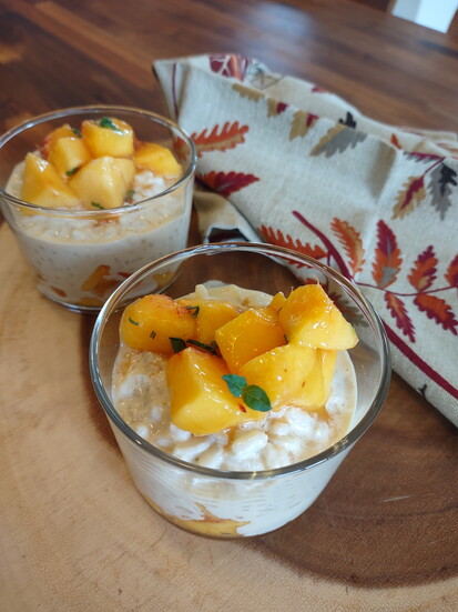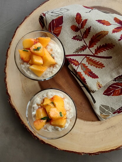 Off heat, stir in butter and basil. Cool and layer pudding with peaches in parfait glasses.