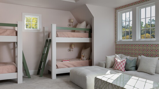 This client’s children are making the transition from wanting lots of toys to wanting more time to hang out with friends. Double bunk beds for sleepovers and plenty of hang-out space is the perfect solution–for parents too.