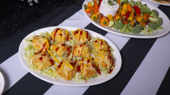 For garnish, sweet and sour sauce and shredded purple cabbage