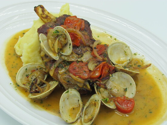 9. To serve, scoop mashed potatoes on plate, place pork chop on top, and pour sauce & clams over.