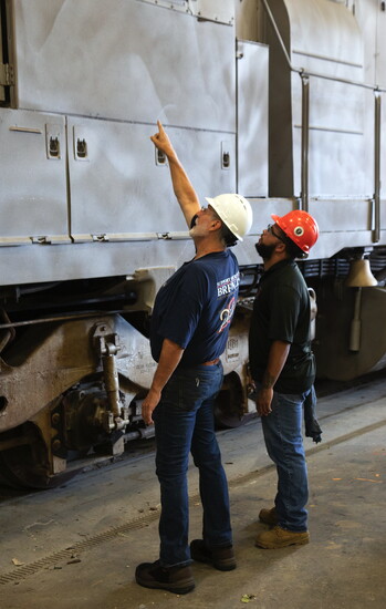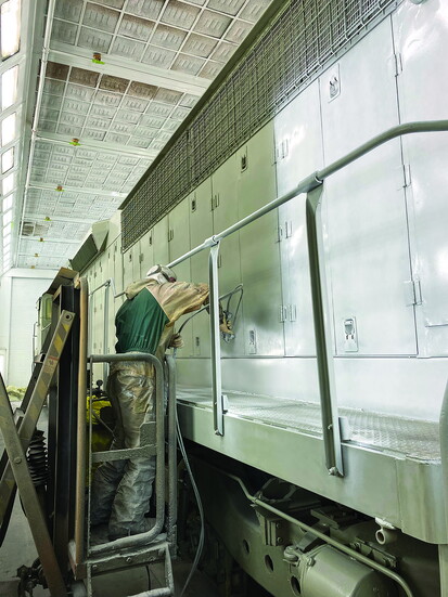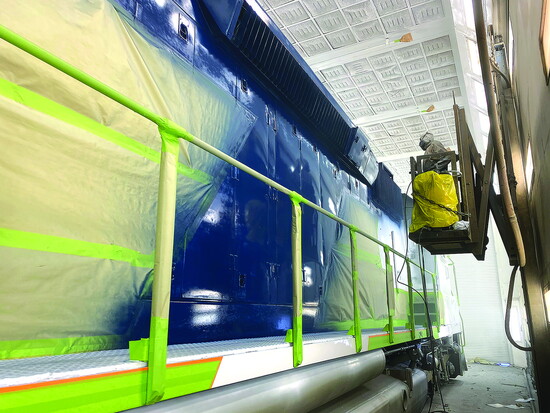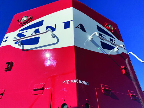 The blast booth at Mid-America Car is modern and very efficient. The booth is enormous and designed with two levels, both open grid, to allow the blast media to fall to the ground and then pass through grids in the floor for separation and recycling. Its media recycling system does a remarkable job of removing and separating the blast media from the blasted paint and years of accumulated dirt. The employee who is blasting wears a protective suit and is supplied with clean air via a circulation hose. It all has a very NASA feeling. Blasting is basically the process of “un-painting” using high-pressure air and gritty media to physically scour the paint from the locomotive’s steel carbody. The worker simply guides the blast media across the locomotive’s surfaces in a loud, dusty process that rips paint from the locomotive. This process can take up to a day. The 5704 and most other Santa Fe locomotives originally had their paint applied over a reddish zinc-chromate primer that resists removal, making the task all the more difficult and lengthier. Once the locomotive was blasted and inspected, residual blasting media was swept and blown off the unit, and the masking and protective coverings were removed. It was thrilling to see a completely bare locomotive stripped down to raw, shiny metal. She looked brand new — from a distance.