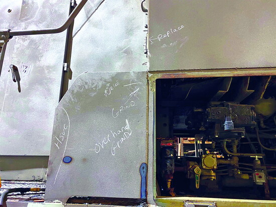 The 5704 was pulled from the blast booth by the Mid-America Car shop switcher (a smaller locomotive) and placed in a well-lit area so that carbody inspections could begin. Almost immediately, we notice salt pitting all along the walkways. Some lower carbody areas also had severe corrosion. Some areas had holes completely through the 1/8-inch steel carbody. Other areas were just decayed, including a spot fore of the engineer’s side dynamic brake blister. This particular decayed area was huge, measuring almost eight inches across. The crews at Mid-America Car made a thorough assessment of the body condition and presented me with the list. It was my job to decide what needed to be done, and I spent a fair amount of time talking with Hank Winn, Vice President and Chief Operations Officer at the Southern California Railway Museum. I made a list of the appliances that had been removed or needed to be altered, including: creating the original radio ground plane and can antenna, reinstalling class lights, reworking the cab-top plumbing and conduit layout, adding large 60-inch herald plates, making the ACI label plates, relocating the headlight to its upper position and blanking the low nose hole, cutting in the oval sight glass window, designing and installing the twin-strobe mounting points, and many more items. Just as many things needed to come off the unit (dummy MU receptacles, ETD antenna, modernized ground plane, knuckle holders, AEI tags, and ditch lights). Removing the items was straightforward. Adding them required creating dimensioned engineering drawings. I worked with original plans for the Santa Fe SD45–2s, as they provided most of the information needed. A mounting system for the large shields was fabricated to prevent them from oscillating due to the moving air at track speed, up to 70 mph. Bolting them on and adding lift rings allows the shop to perform necessary maintenance. These were very heavy!