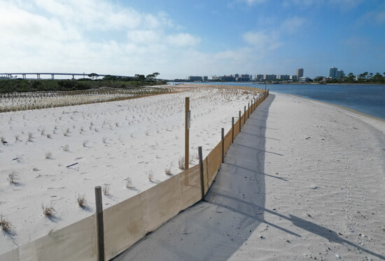 Each design aims to minimize impacts to existing seagrass beds surrounding the Robinson, Walker, and Bird Islands. Specifically, the “hummingbird” shape of the western placement area and the “kidney bean” shape of the eastern placement area on Walker Island are designed to protect and reduce impacts to valuable seagrasses and allow room for their expansion. In these areas, the team installed native plants such as sea oats, marsh grasses, and other species following sand placement. These plants will help hold the new material in place, reduce erosion on the islands, and provide shelter and foraging areas for both fish and wildlife species.