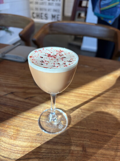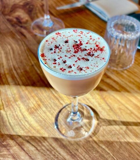 Add everything into a cocktail shaker. Shake vigorously for 10 to 15 seconds, then add ice, double-strain, and pour into a Nick & Nora glass. Garnish with crushed pink peppercorn.